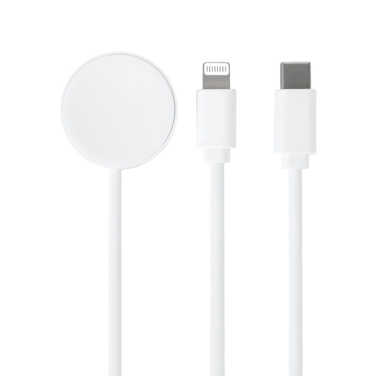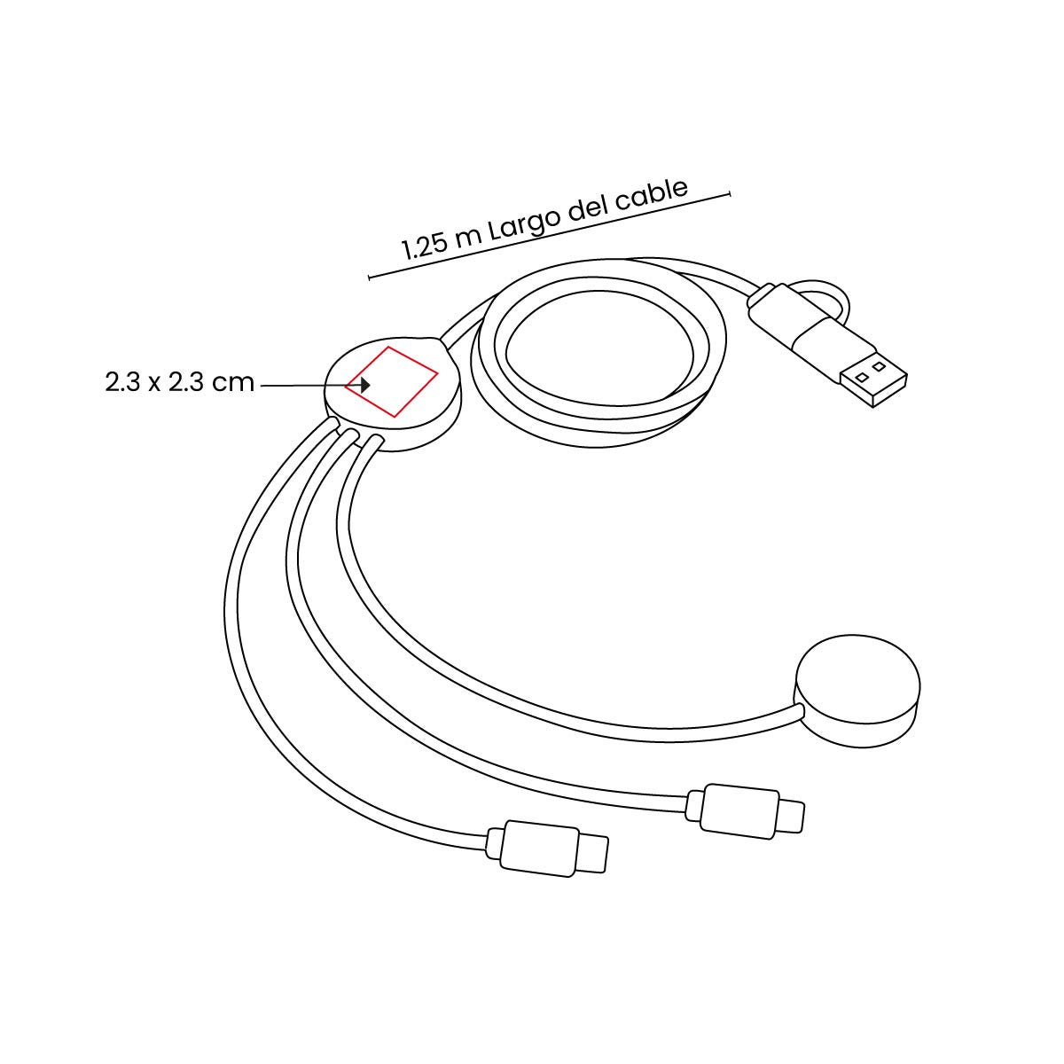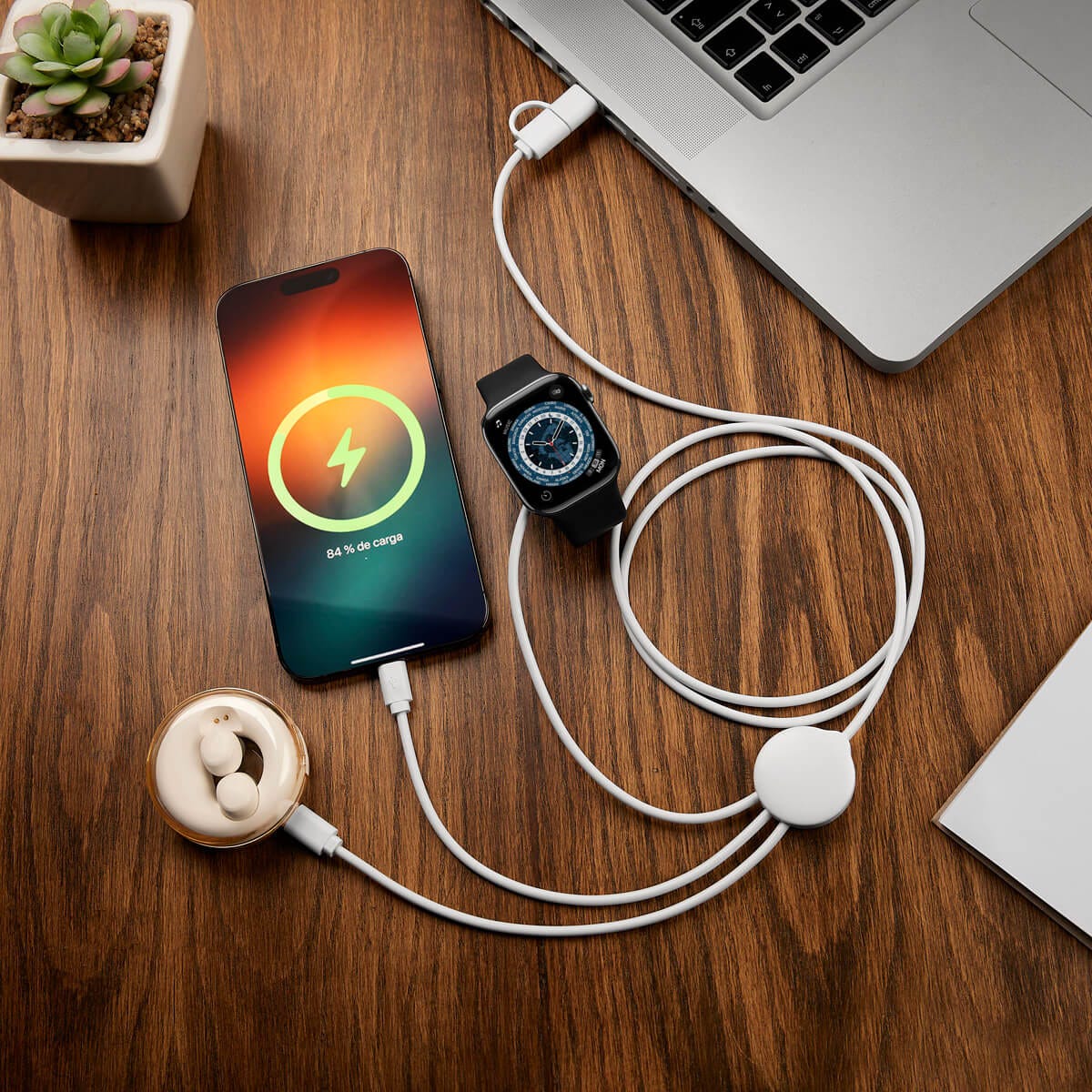 Cable cargador 5 en 1. Incluye conector de entrada USB y tipo C, conector de salida lightning (8 pines), micro USB, tipo C y cargador inalámbrico para reloj inteligente.