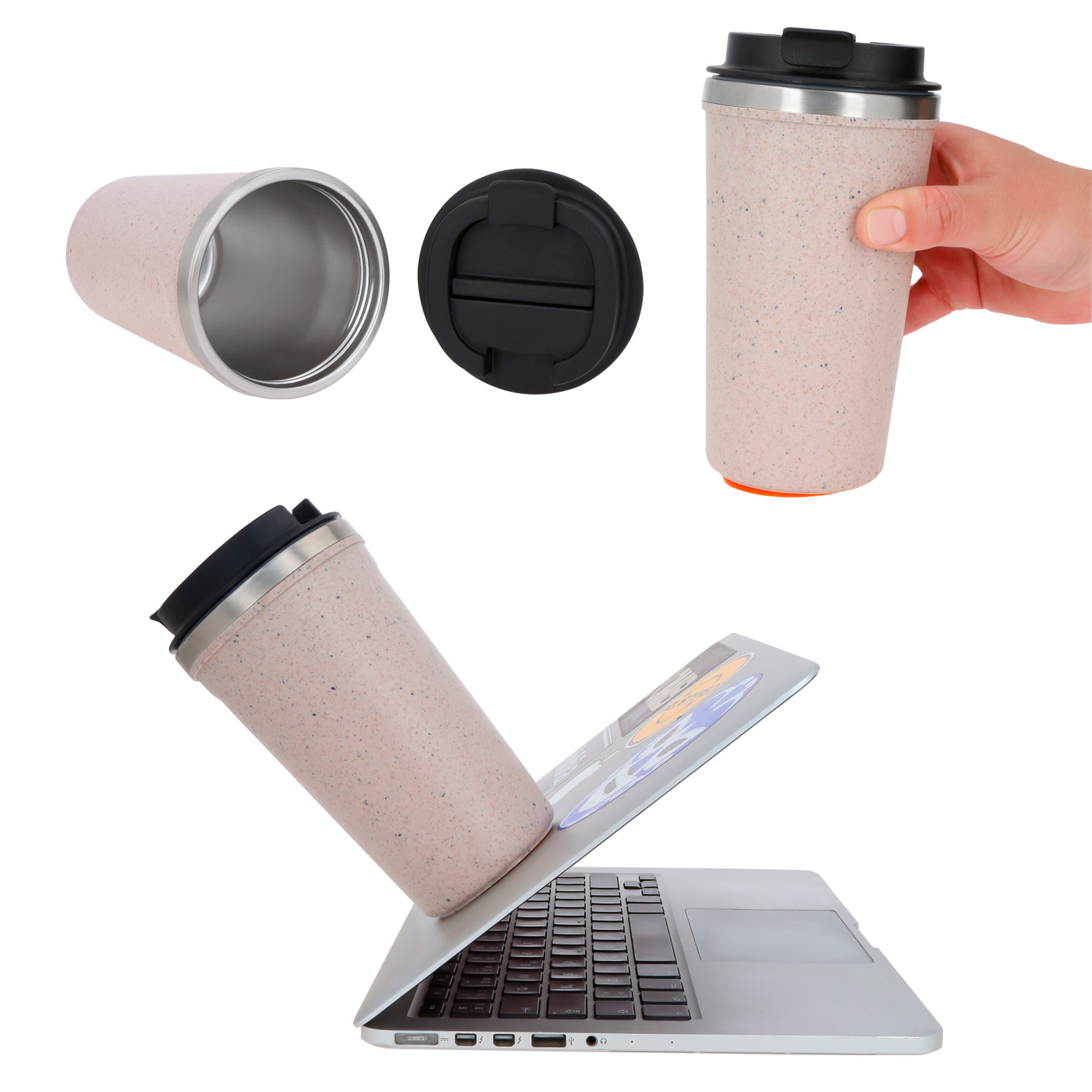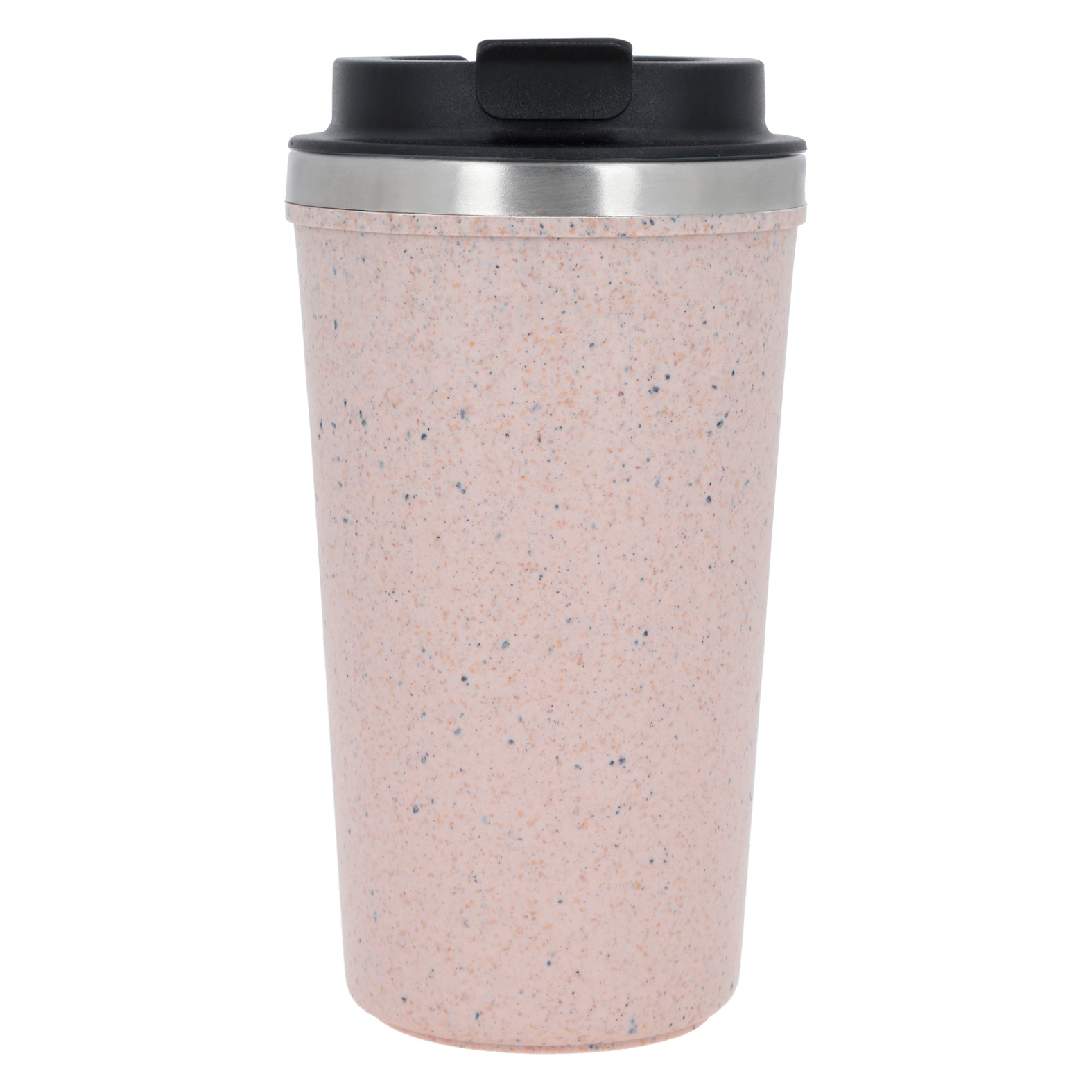 Termo de doble pared de acero inoxidable y exterior de plástico elaborado a base de granos de café reciclado con tapa plástica enroscable.