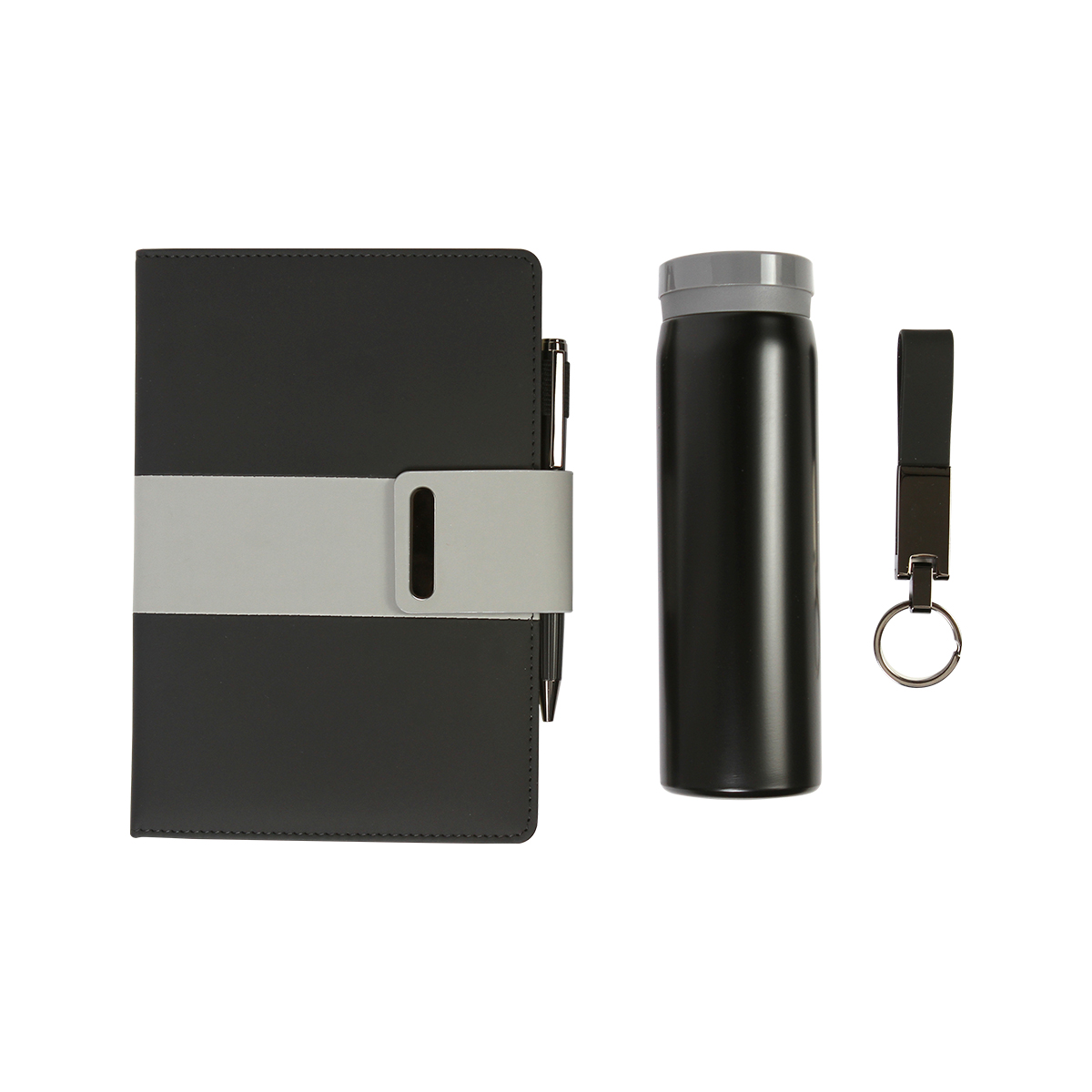 Set ejecutivo 4 en 1. Incluye libreta de 100 hojas de 80 g, bolígrafo tipo ball pen de acero inoxidable con tinta de escritura en color negro, llavero fabricado en PU y acero y termo de 350 ml fabricado en acero.