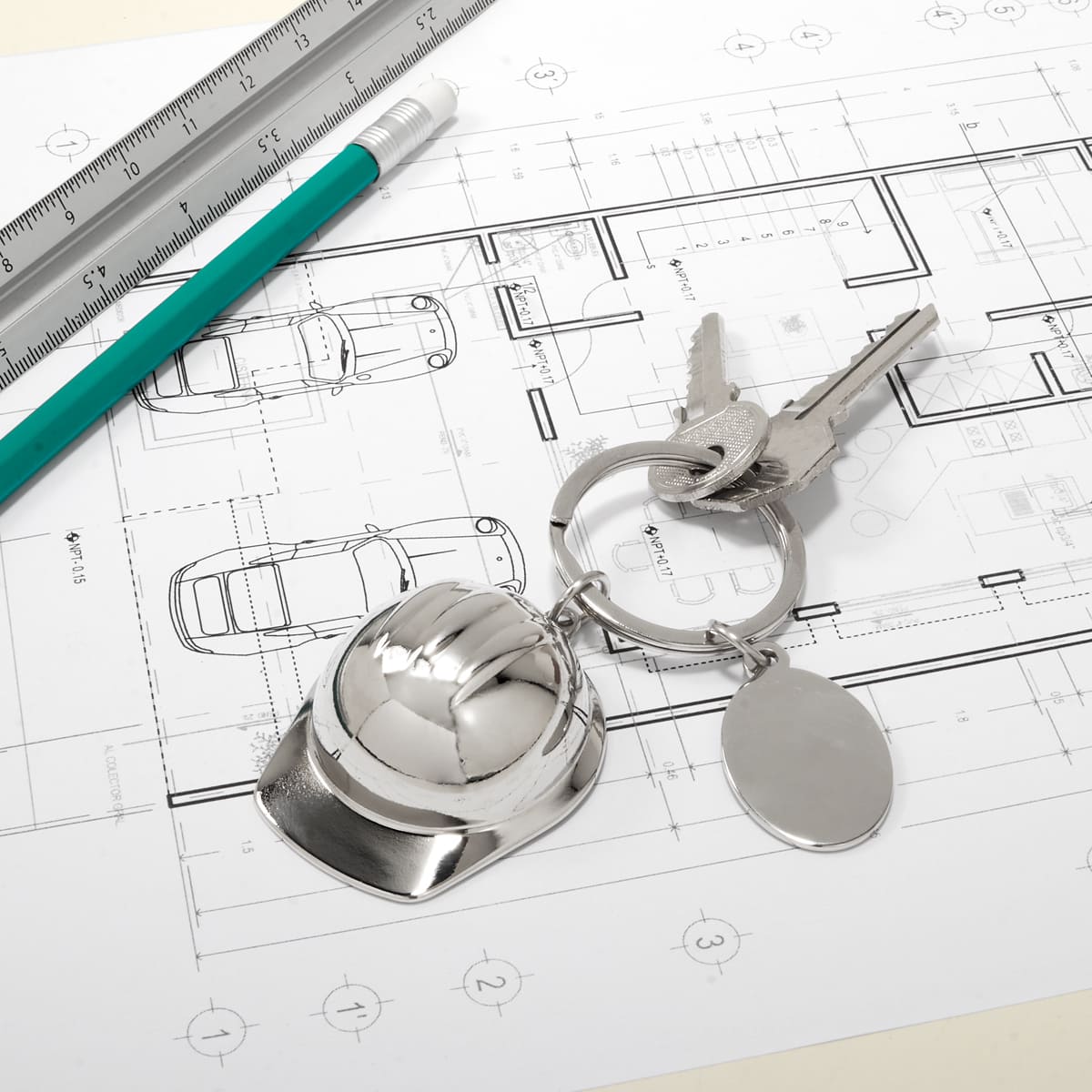 Llavero metálico con diseño en forma de casco. Accesorio perfecto para el sector industrial, construcción y seguridad. Incluye una placa ovalada para personalizar.