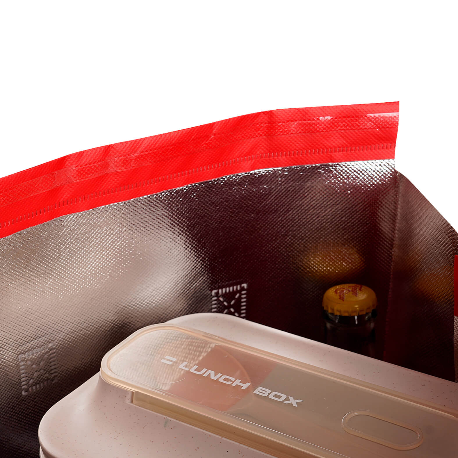 Bolsa de non woven con interior metalizado, laminado y termosellado con asas. Cuenta con una pestaña en la parte superior con pegamento reutilizable para cerrar la bolsa.