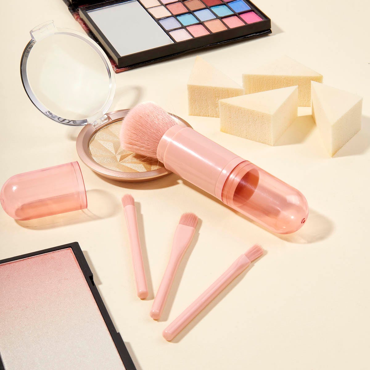 Set de brochas para maquillaje 4 en 1. Este kit innovador ahorra espacio sin sacrificar lo esencial. Incluye brocha para aplicar rubor, 2 brochas de diferente grosor para la aplicación de sombras y brocha para labios.