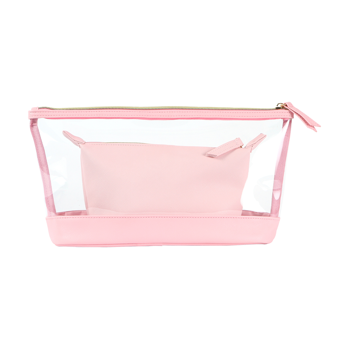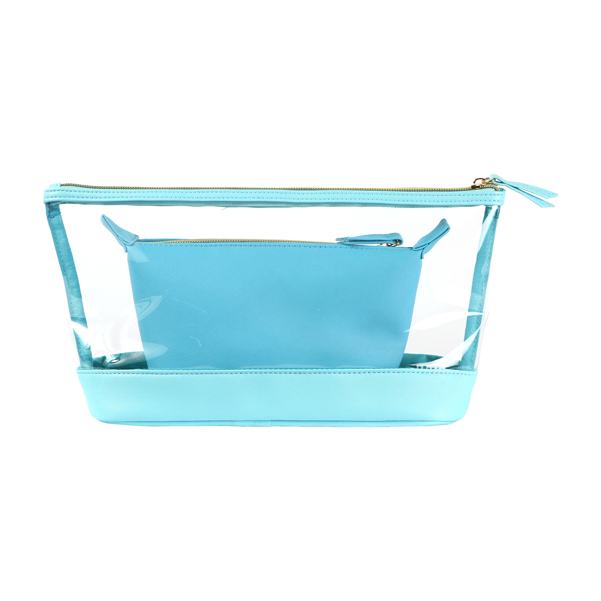 uego de dos cosmetiqueras, ideal para viajes o uso diario. Incluye una cosmetiquera grande fabricada en plástico PVC transparente, perfecta para visualizar y acceder rápidamente a su contenido, con cierre seguro y diseño resistente.